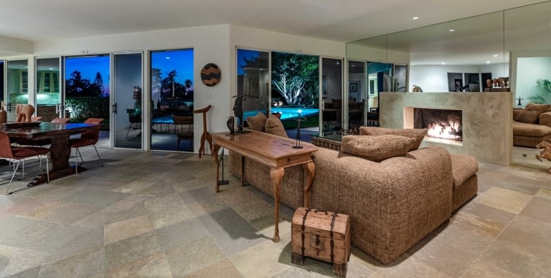A striking, modern stone fireplace serves as the centerpiece for this 2,650-square-foot Hollywood Hills estate represented by James Harris and David Parnes. The single-level home offers epic, treetop-framed sunset views from its hillside perch. Kick back by the fire while taking in the lush, grassy backyard and pool—this is SoCal indoor-outdoor living at its finest.